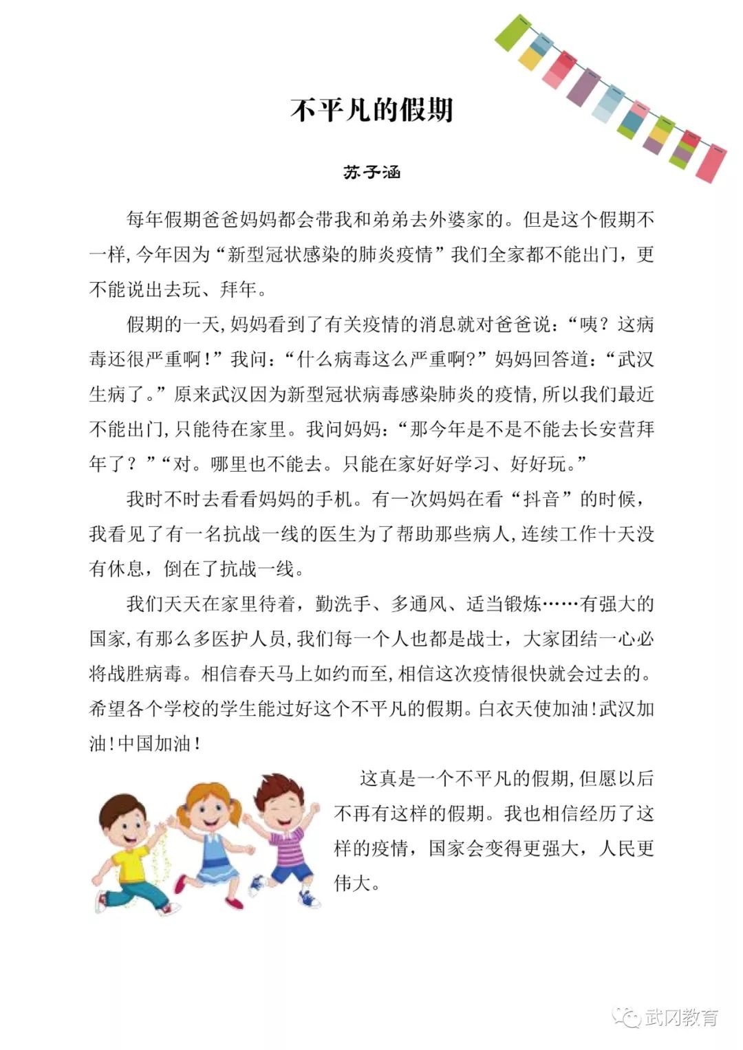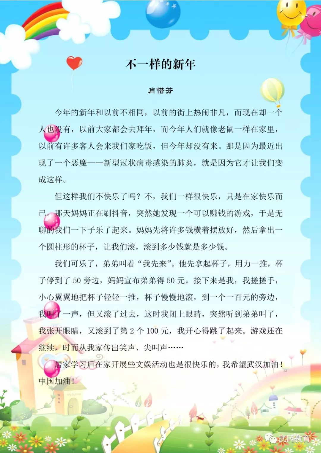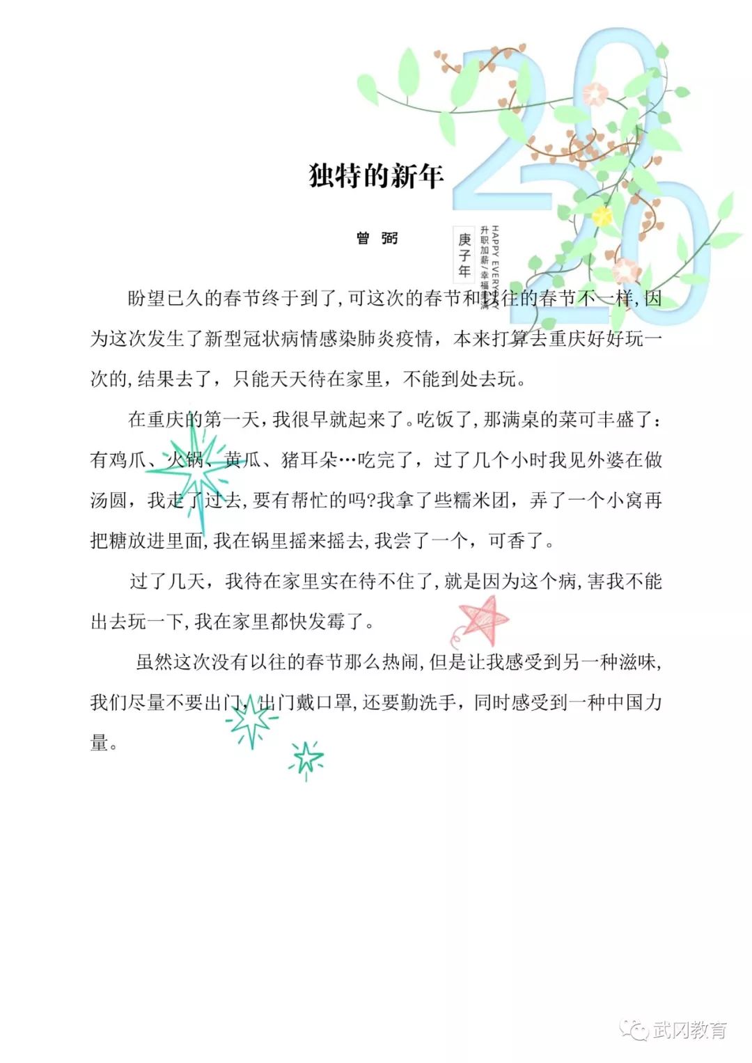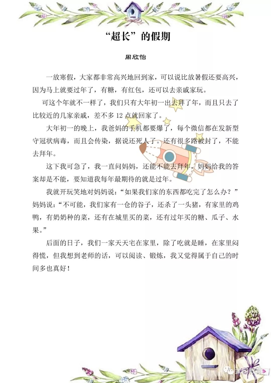 刘想艳老师所教的湖南武冈市思源实验学校小学部17班,每周出版一期《班级作文周报》,已坚持一学期。虽然疫情来袭,但孩子们用他们稚嫩的语言描写出这个特殊寒假别样的感受;家长朋友们用他们的亲身体会告诉孩子们什么是大爱与担当。“武汉加油!湖北加油!中国加油!”这响彻神舟大地的铿锵话语定将化作股股战胜病毒的力量。与时间赛跑,与病毒较量。这期别样的周报以这样的方式与大家见面,让我们共同期待:春暖花开,繁花与共。