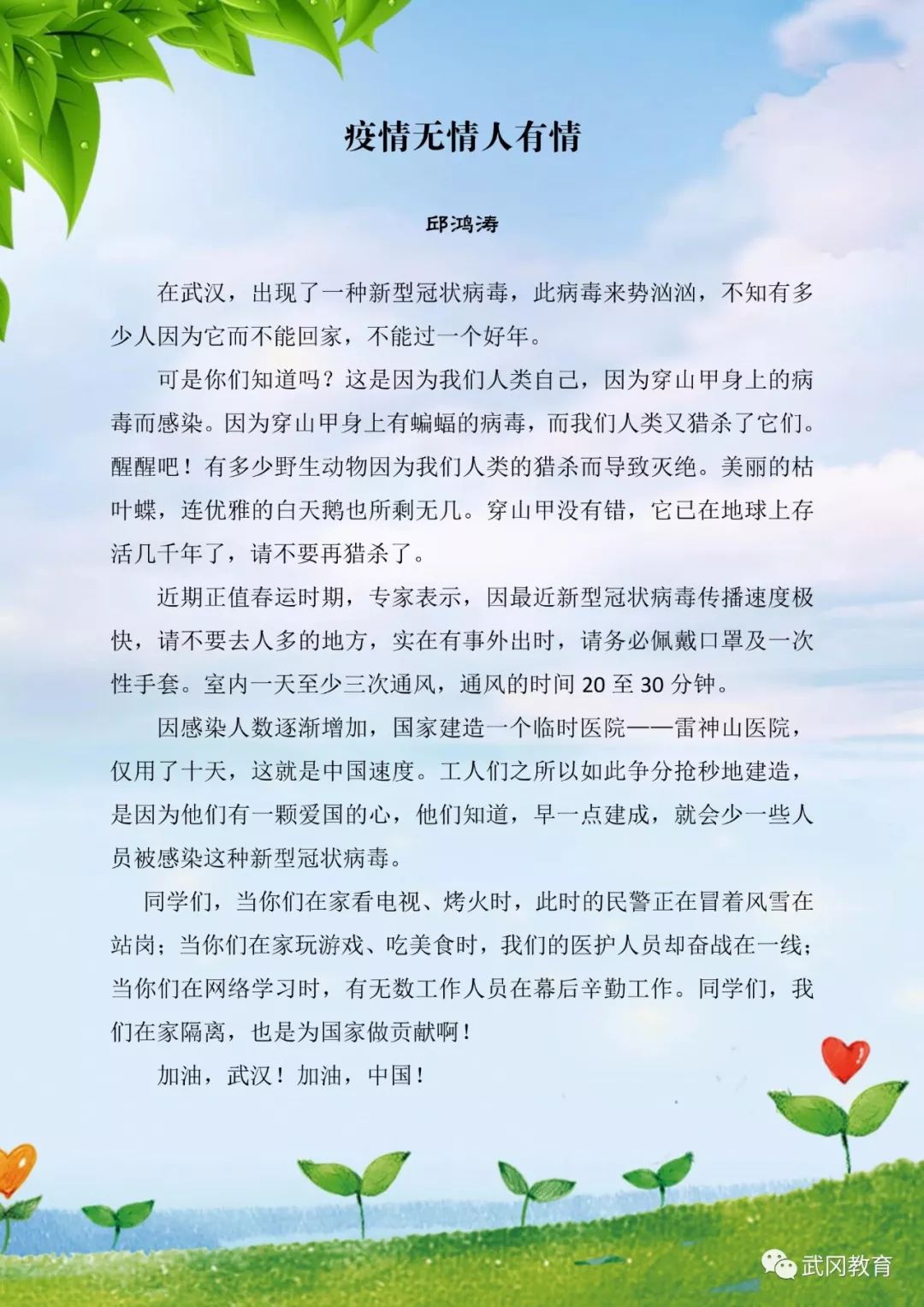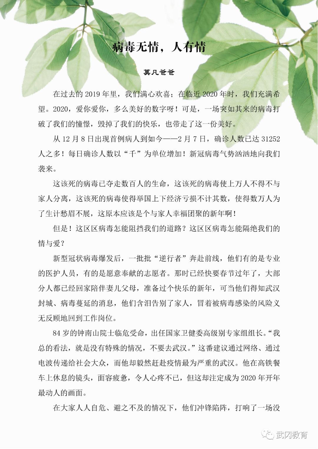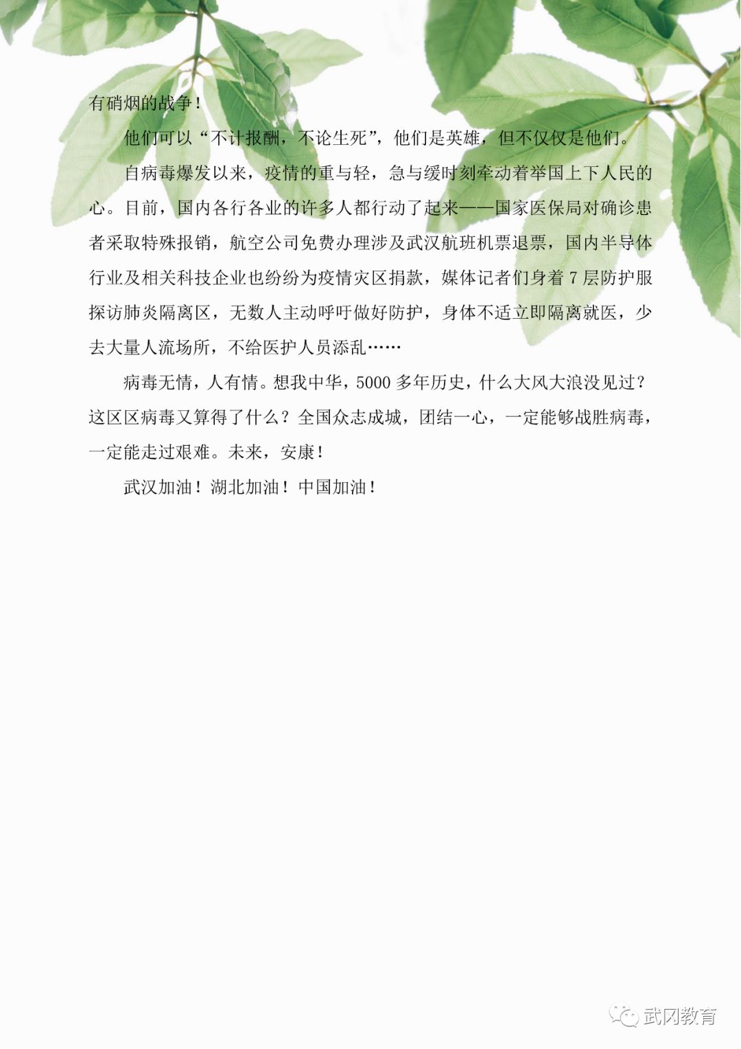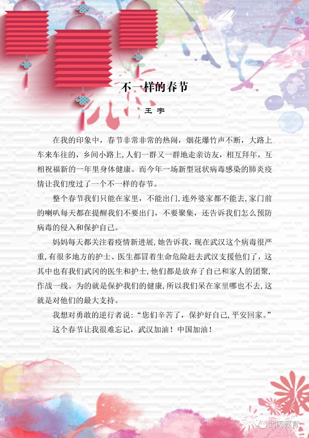 刘想艳老师所教的湖南武冈市思源实验学校小学部17班,每周出版一期《班级作文周报》,已坚持一学期。虽然疫情来袭,但孩子们用他们稚嫩的语言描写出这个特殊寒假别样的感受;家长朋友们用他们的亲身体会告诉孩子们什么是大爱与担当。“武汉加油!湖北加油!中国加油!”这响彻神舟大地的铿锵话语定将化作股股战胜病毒的力量。与时间赛跑,与病毒较量。这期别样的周报以这样的方式与大家见面,让我们共同期待:春暖花开,繁花与共。