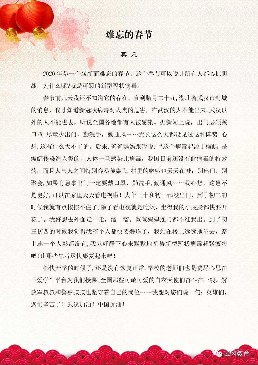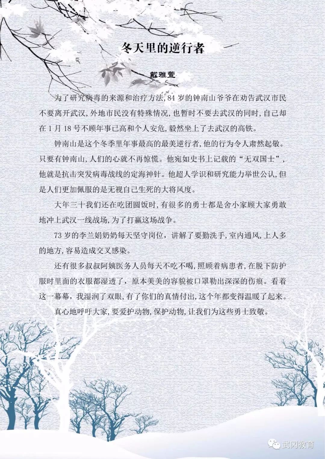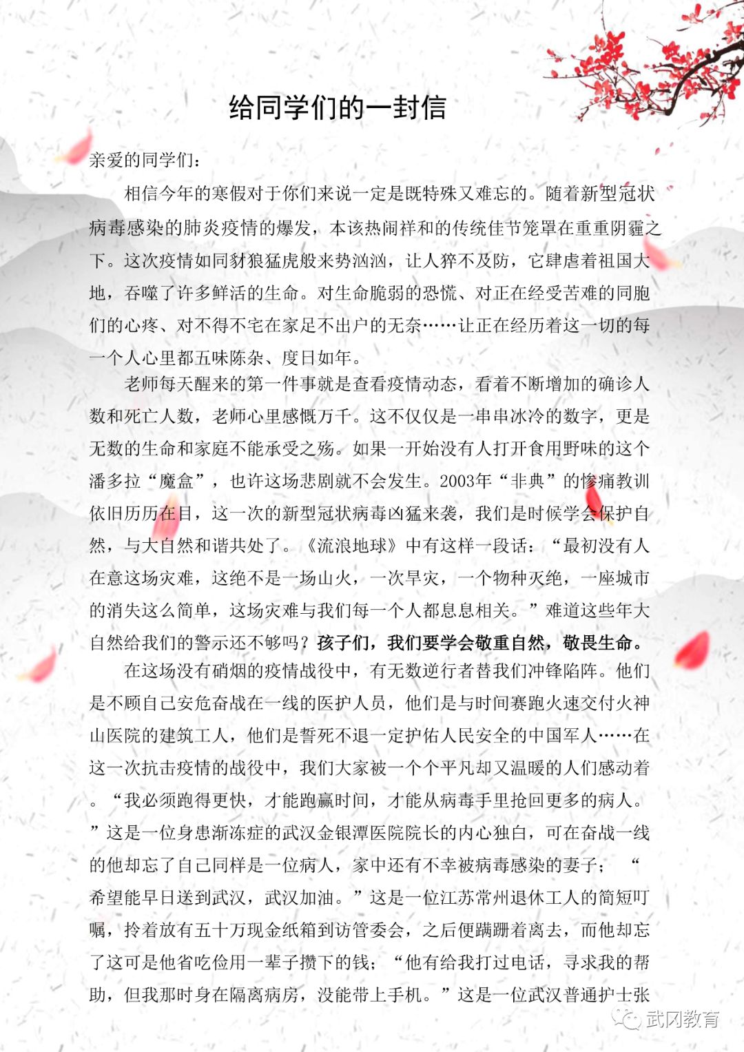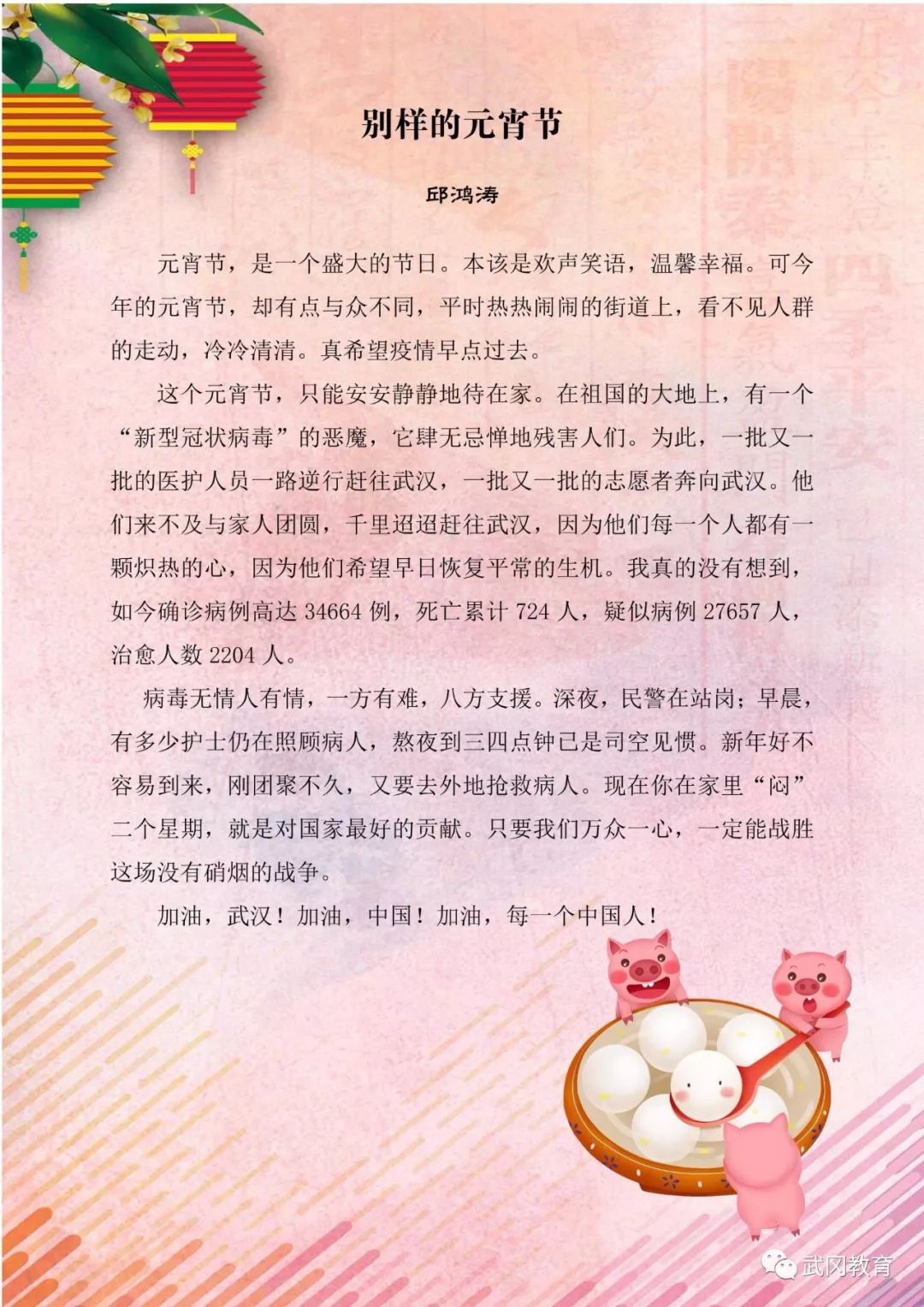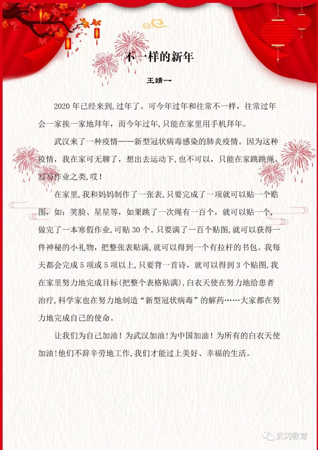 刘想艳老师所教的湖南武冈市思源实验学校小学部17班,每周出版一期《班级作文周报》,已坚持一学期。虽然疫情来袭,但孩子们用他们稚嫩的语言描写出这个特殊寒假别样的感受;家长朋友们用他们的亲身体会告诉孩子们什么是大爱与担当。“武汉加油!湖北加油!中国加油!”这响彻神舟大地的铿锵话语定将化作股股战胜病毒的力量。与时间赛跑,与病毒较量。这期别样的周报以这样的方式与大家见面,让我们共同期待:春暖花开,繁花与共。
