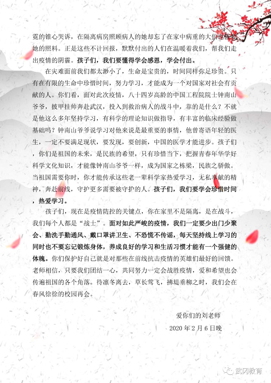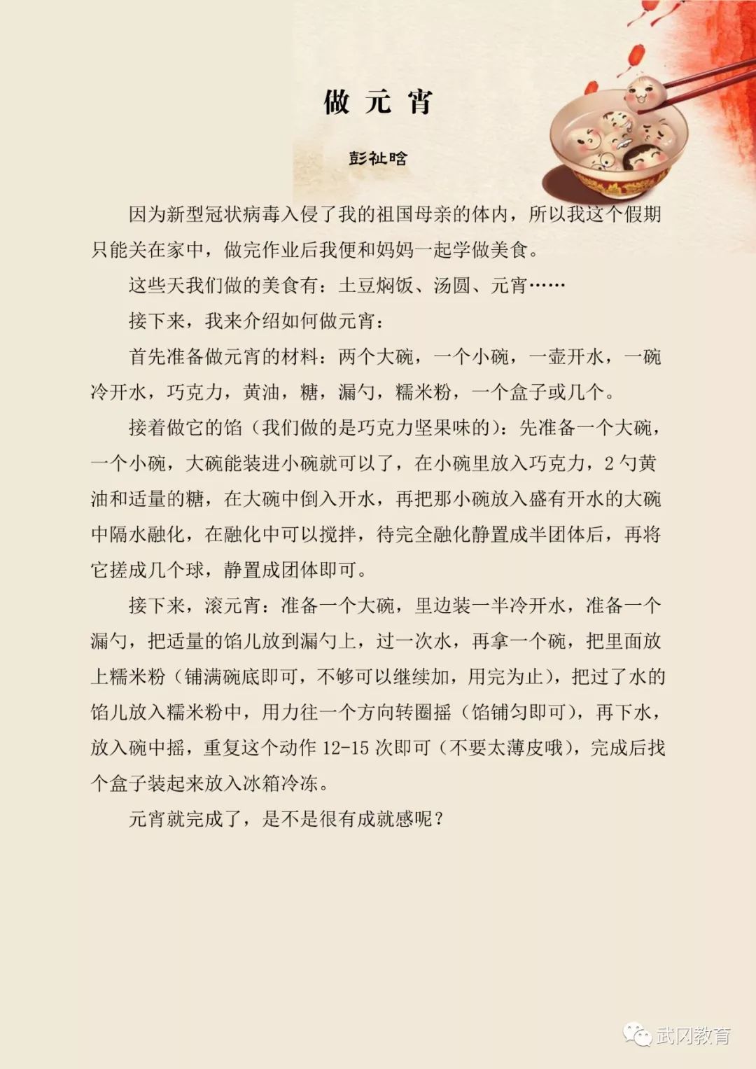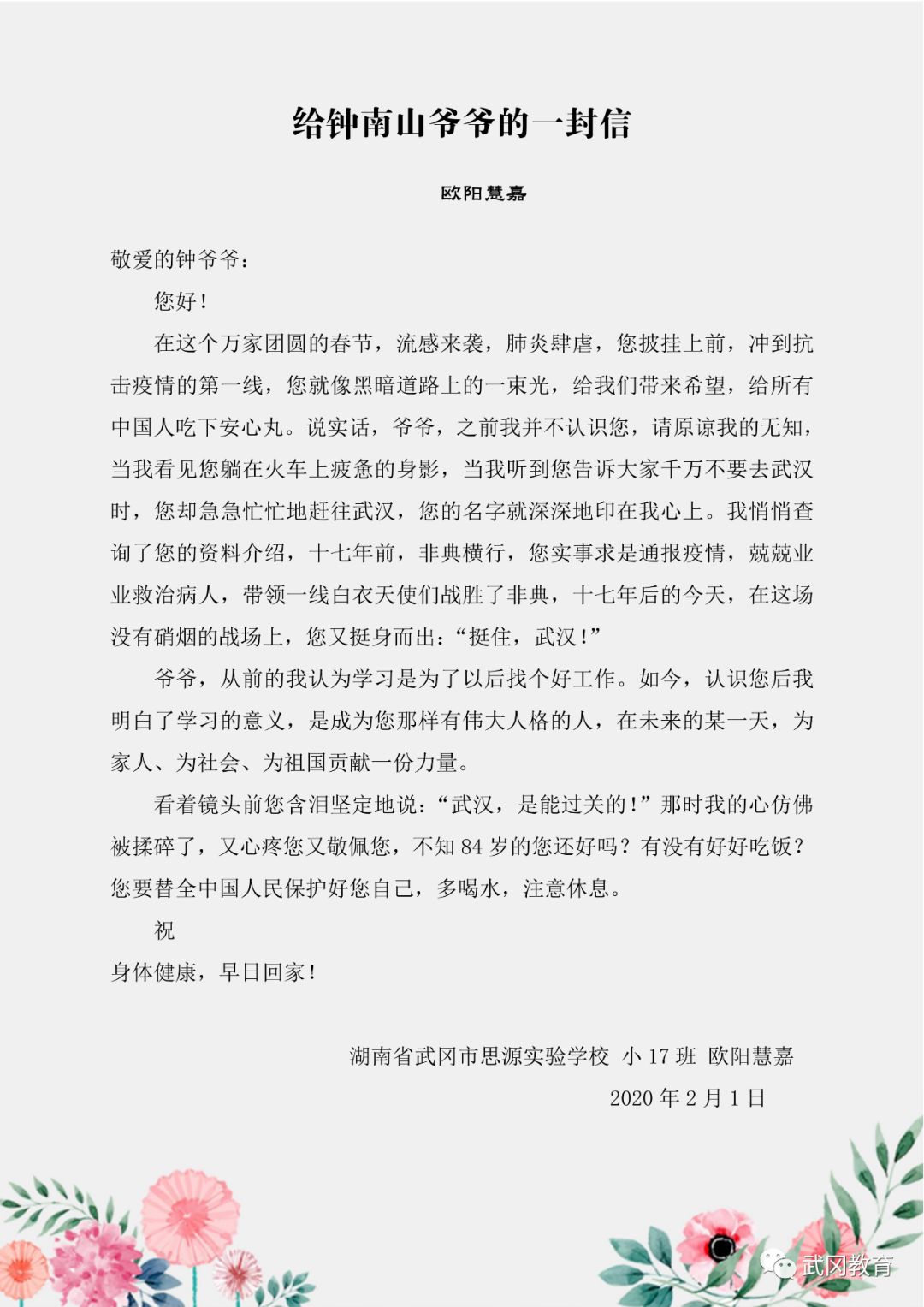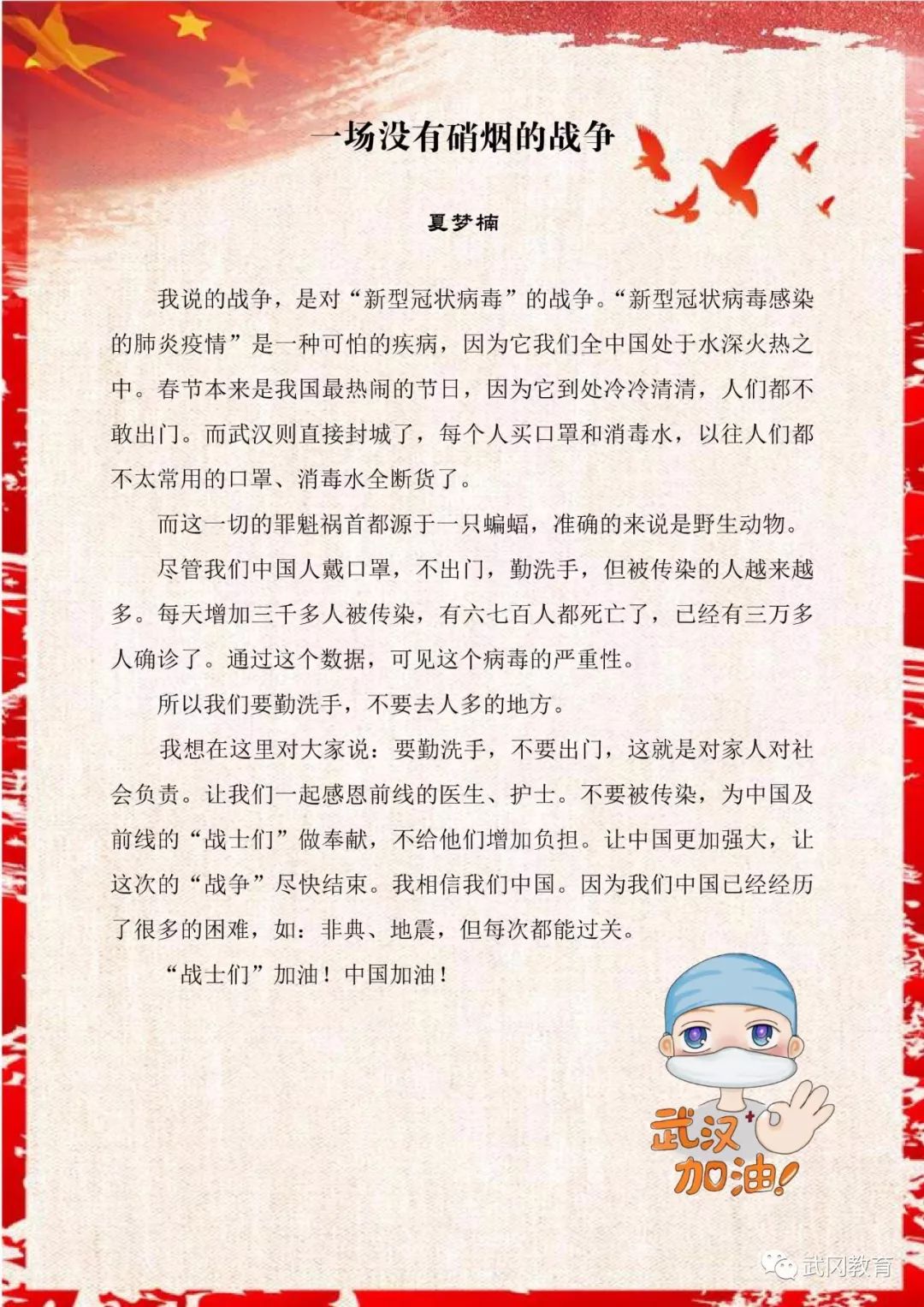 刘想艳老师所教的湖南武冈市思源实验学校小学部17班,每周出版一期《班级作文周报》,已坚持一学期。虽然疫情来袭,但孩子们用他们稚嫩的语言描写出这个特殊寒假别样的感受;家长朋友们用他们的亲身体会告诉孩子们什么是大爱与担当。“武汉加油!湖北加油!中国加油!”这响彻神舟大地的铿锵话语定将化作股股战胜病毒的力量。与时间赛跑,与病毒较量。这期别样的周报以这样的方式与大家见面,让我们共同期待:春暖花开,繁花与共。