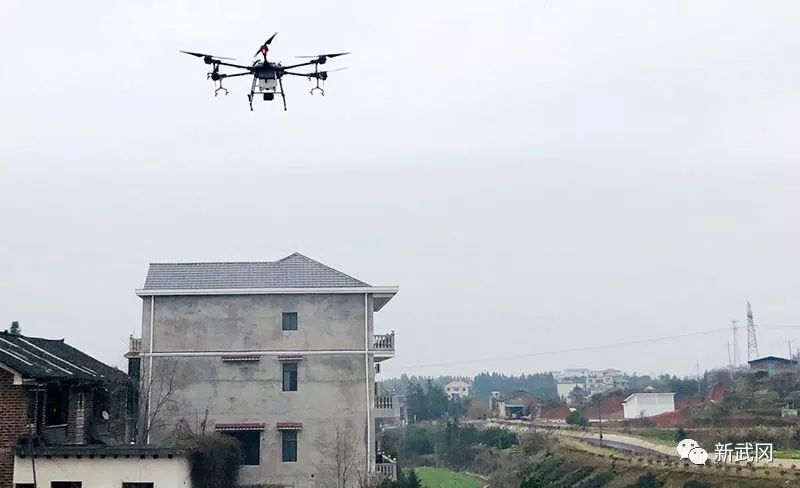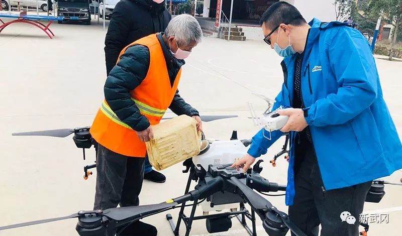 “注意:要平稳降落了,请大家散开一点,不要围观。”2月10日上午,谢四平在蔡家塘村村部前全神贯注地操纵无人机方向杆,随之向周围的村民发出“指令”。不一会儿,一架黑色的大疆T16缓缓从空中盘旋降落,稳当当地停在场地中间,谢四平的助手迅速打开机盖填装消毒药水。