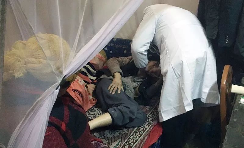 △做完诊疗躺在病床上的周小平医生