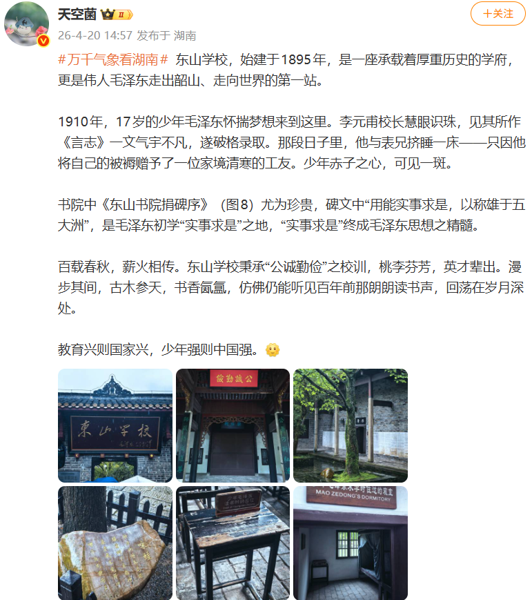 “东山学校,始建于1895年,是一座承载着厚重历史的学府,更是伟人毛泽东走出韶山、走向世界的第一站。”网络名人@天空菌 向1680万粉丝介绍了毛泽东在东山学校求学的故事:1910年,17岁的少年毛泽东怀揣梦想来到这里。李元甫校长慧眼识珠,见其所作《言志》一文气宇不凡,遂破格录取。那段日子里,他与表兄挤睡一床——只因他将自己的被褥赠予了一位家境清寒的工友。少年赤子之心,可见一斑。书院中《东山书院捐碑序》尤为珍贵,碑文中“用能实事求是,以称雄于五大洲”,是毛泽东初学“实事求是”之地,“实事求是”终成毛泽东思想之精髓。
