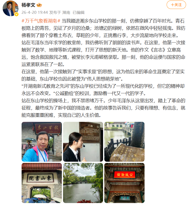 参观完伟人故里后,网络名人们继续追寻红色足迹,来到“走出韶山冲的第一站”——湘乡东山学校。中国互联网协会特邀专家、网络名人@杨孝文 感触颇深:当我踏进湘乡东山学校的那一刻,仿佛穿越了百年时光。青石板路上的青苔,见证了岁月的沧桑;池塘边的绿树,依然在微风中轻轻摇曳。我仿佛看到了那个穿着土布衣、草鞋的少年,正挑着行李,大步流星地向学校走来。