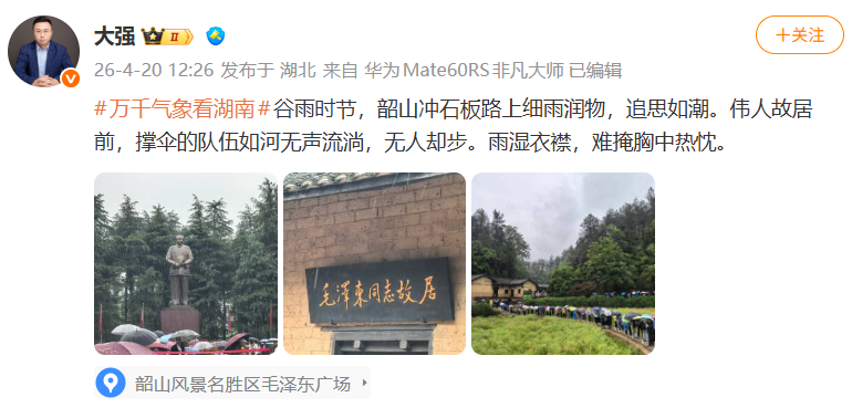 这是一场身体和精神的双重“洗礼”。网络名人@大强 说:谷雨时节,韶山冲石板路上细雨润物,追思如潮。伟人故居前,撑伞的队伍如河无声流淌,无人却步。雨湿衣襟,难掩胸中热忱。