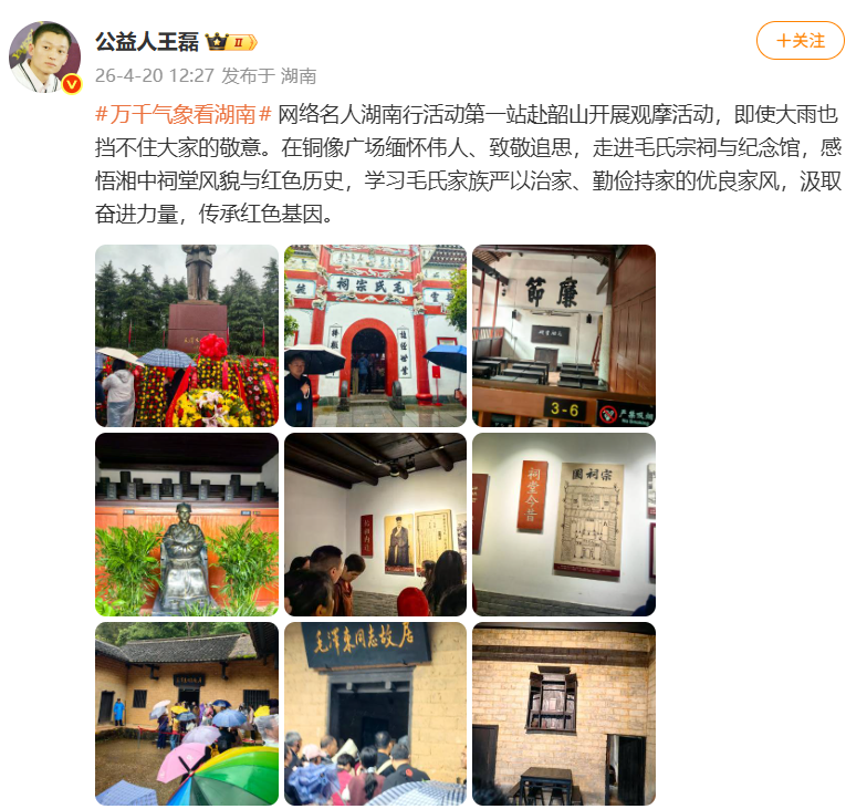 微博2024最具影响力公益大V@公益人王磊则对毛氏宗祠的家风传承印象深刻:在毛泽东广场缅怀伟人、致敬追思,走进毛氏宗祠与纪念馆,感悟湘中祠堂风貌与红色历史,学习毛氏家族严以治家、勤俭持家的优良家风,汲取奋进力量,传承红色基因。