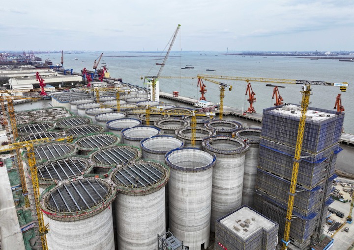 在江苏省靖江市拍摄的中粮靖江码头仓储物流项目建设现场(2025年2月20日摄,无人机照片)。新华社发(顾继红摄)