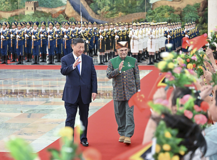 7月29日上午,国家主席习近平在北京人民大会堂同来华进行国事访问的东帝汶总统奥尔塔举行会谈。这是会谈前,习近平在人民大会堂北大厅为奥尔塔举行欢迎仪式。新华社记者 张领 摄