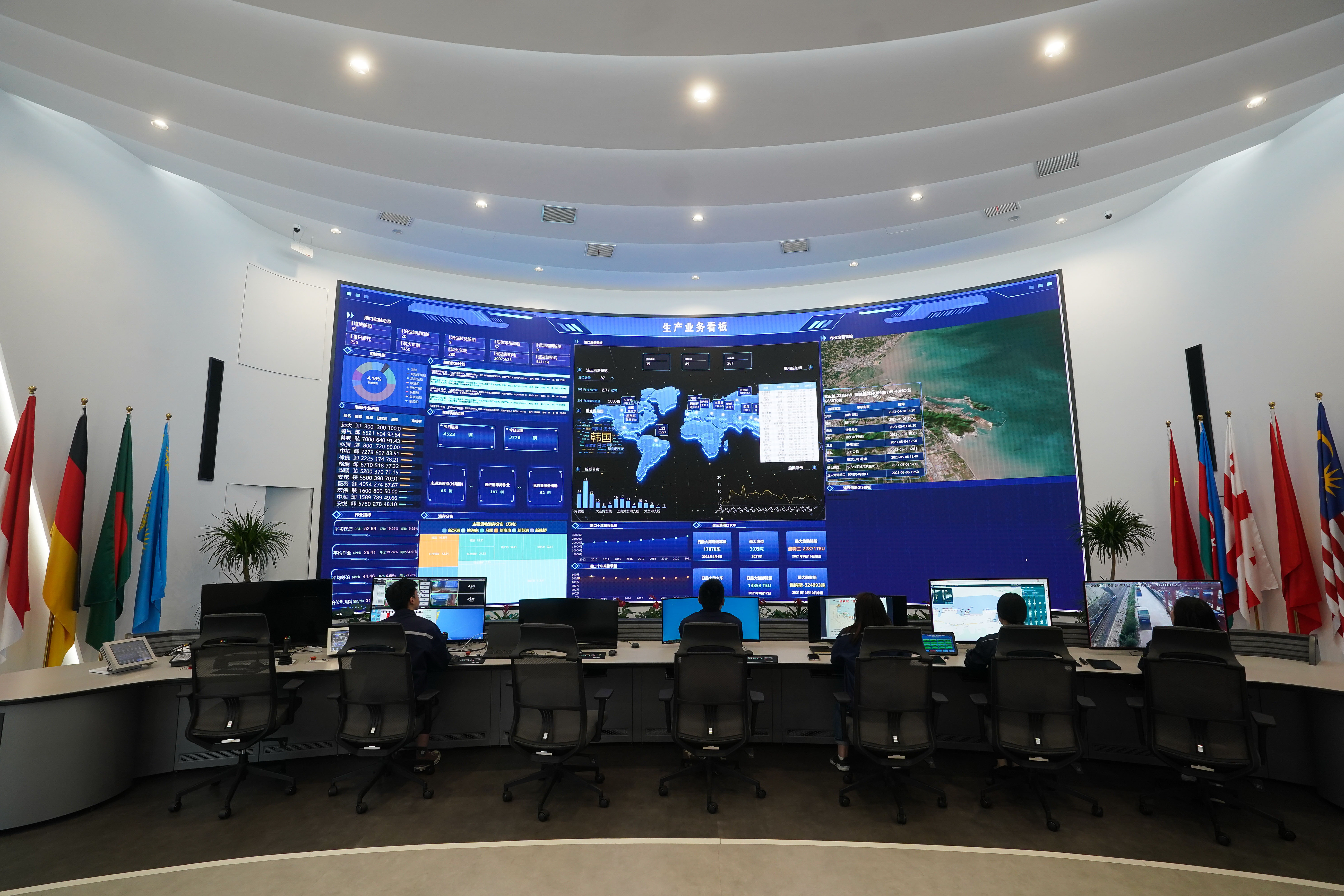 2023年5月9日,工作人员在中哈连云港物流合作基地数字化调度中心查看实时作业数据。在中哈连云港物流合作基地十几公里外,上合组织(连云港)国际物流园内车辆川流不息,现代物流、新材料、新能源等产业稳步发展。