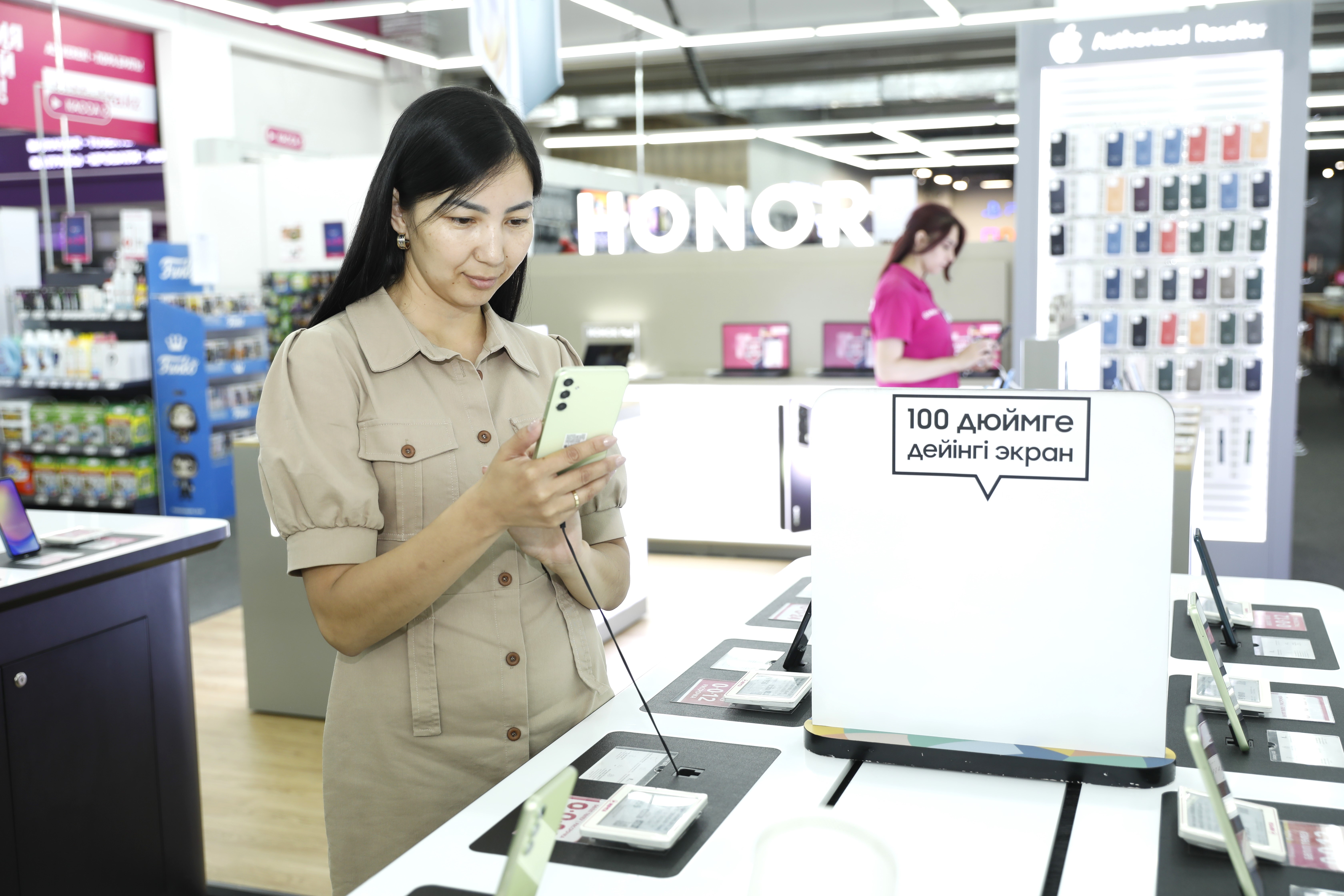 2024年7月1日,顾客在哈萨克斯坦阿斯塔纳试用中国品牌手机。新华社发(奥斯帕诺夫摄)
