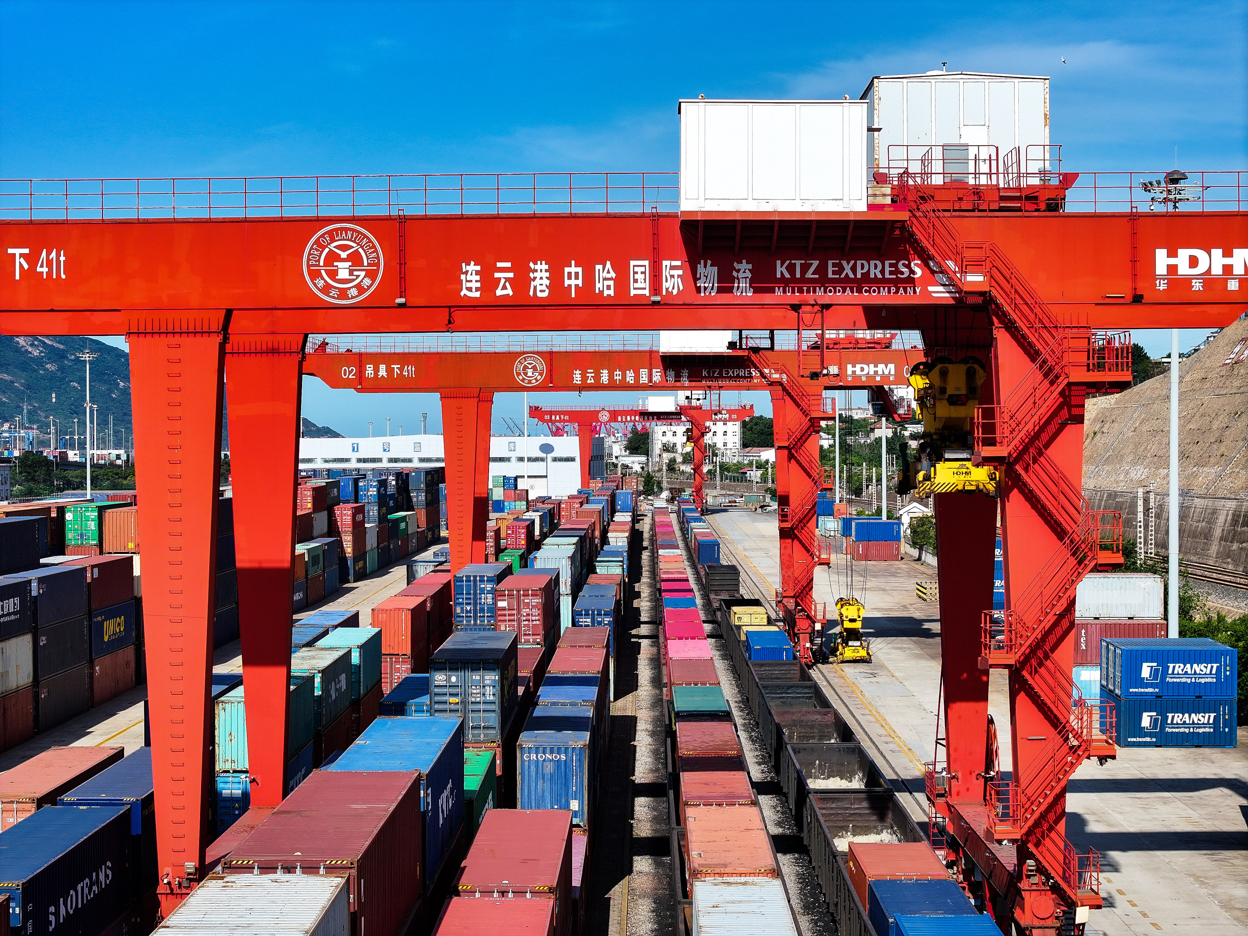 2024年6月26日,集装箱搬运机在上合组织(连云港)国际物流园运送集装箱(无人机照片)。依托物流合作,连云港为中亚地区产品提供了便捷的出海口。中欧班列上,机电设备、电子产品、日用百货等“中国制造”经哈萨克斯坦,转往中亚、欧洲市场,铁合金、化肥等哈萨克斯坦所产原料及产品被运抵中哈连云港物流合作基地,由此扬帆起航,进入广阔的太平洋。