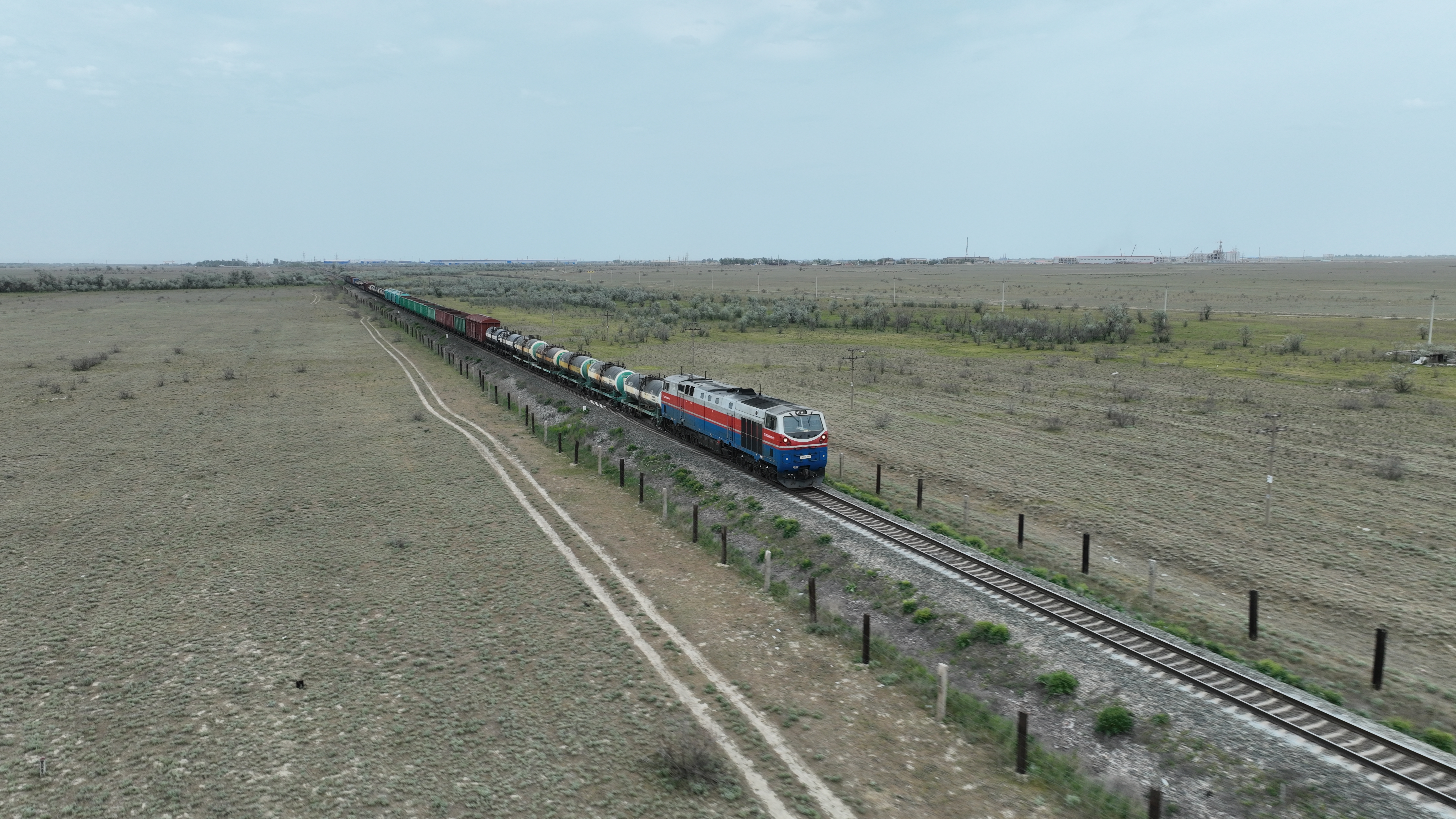 2023年5月12日,在哈萨克斯坦阿拉木图附近,货运列车驰骋于阿拉木图与霍尔果斯间(无人机照片)。新华社发(奥斯帕诺夫摄)西行东进,贸易畅通为中国与中亚人民带来了更多实惠。2023年,中国成为哈第一大贸易伙伴国,两国贸易额达410亿美元,同比增长32%。