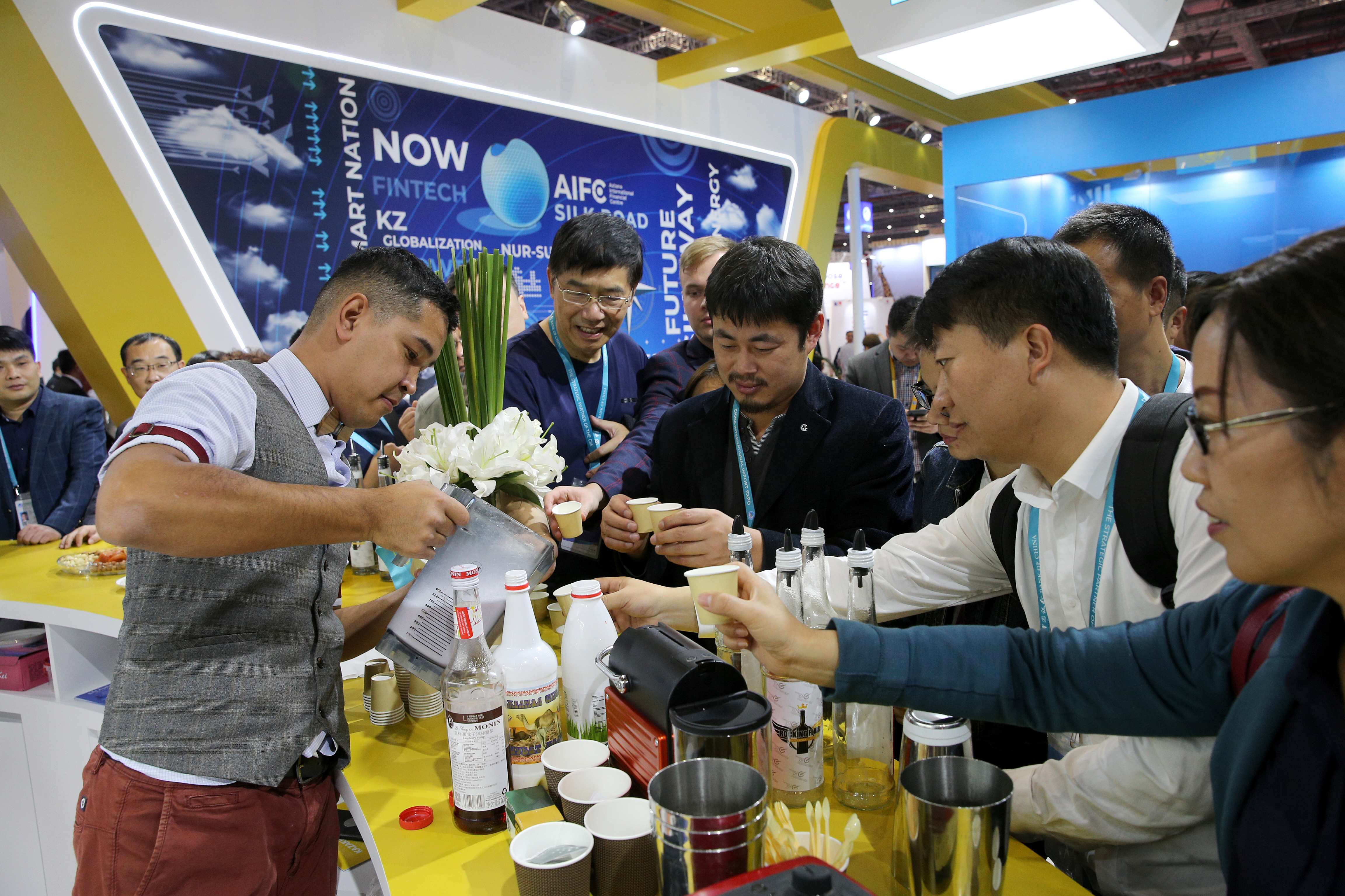 2019年11月6日,在上海进博会哈萨克斯坦国家馆,调酒师为参观者分享鸡尾酒。