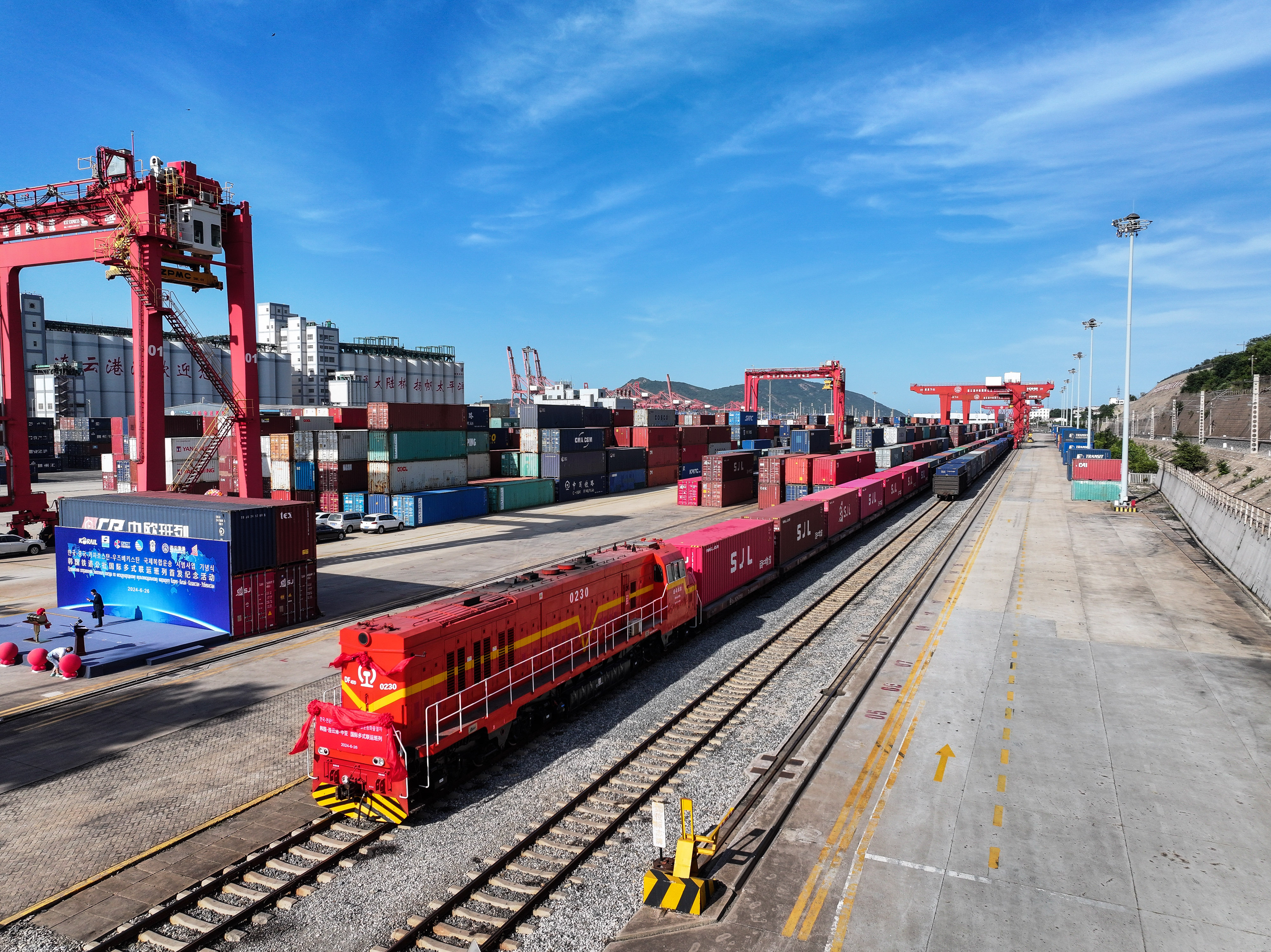 2024年6月26日,在中哈连云港物流合作基地,“韩国-连云港-中亚”国际多式联运班列静待开行(无人机照片)。
