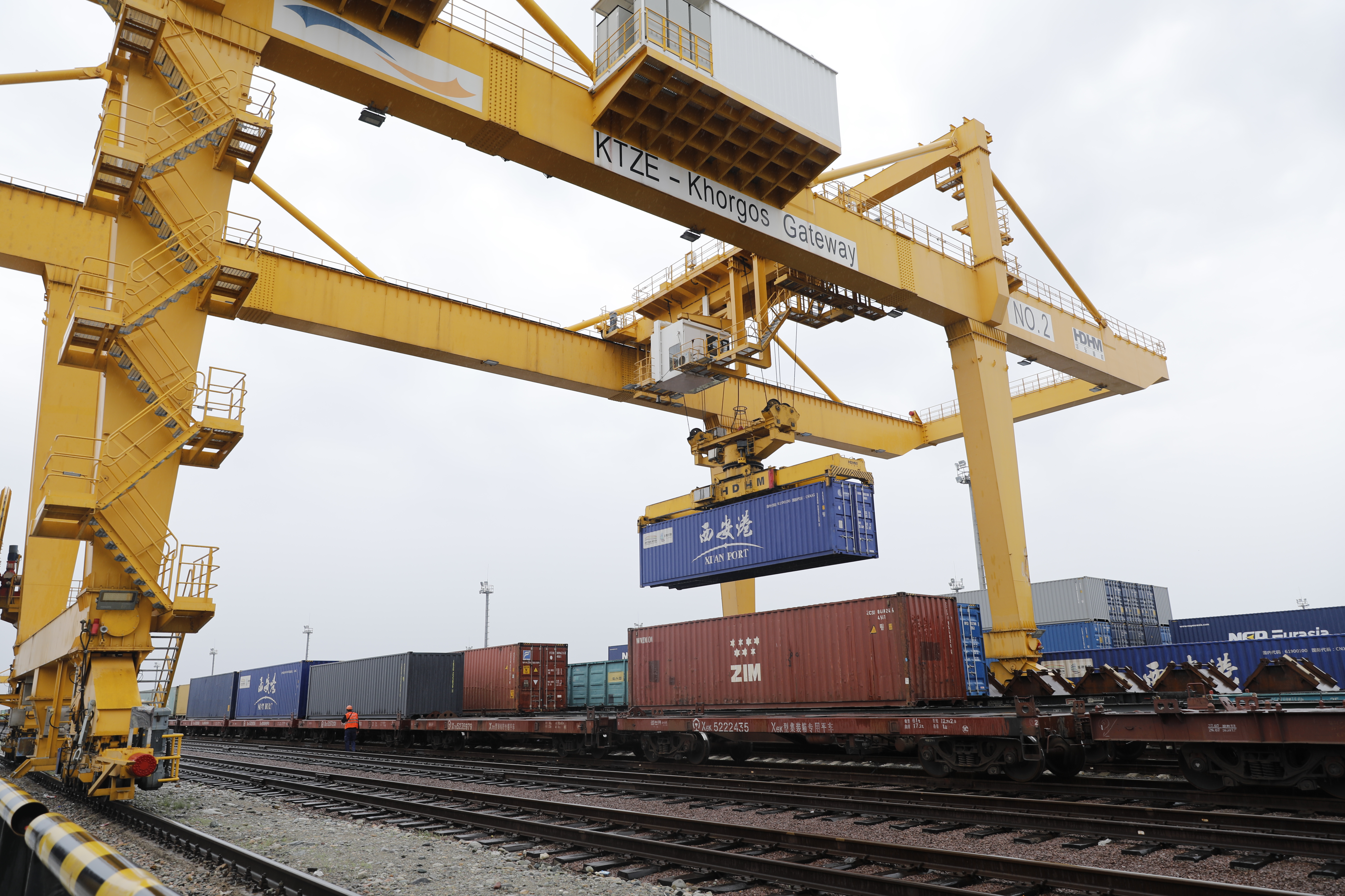2022年5月19日,在哈萨克斯坦南部中哈边境地区的“霍尔果斯-东大门”无水港内,龙门吊正在工作。新华社发(奥斯帕诺夫摄)