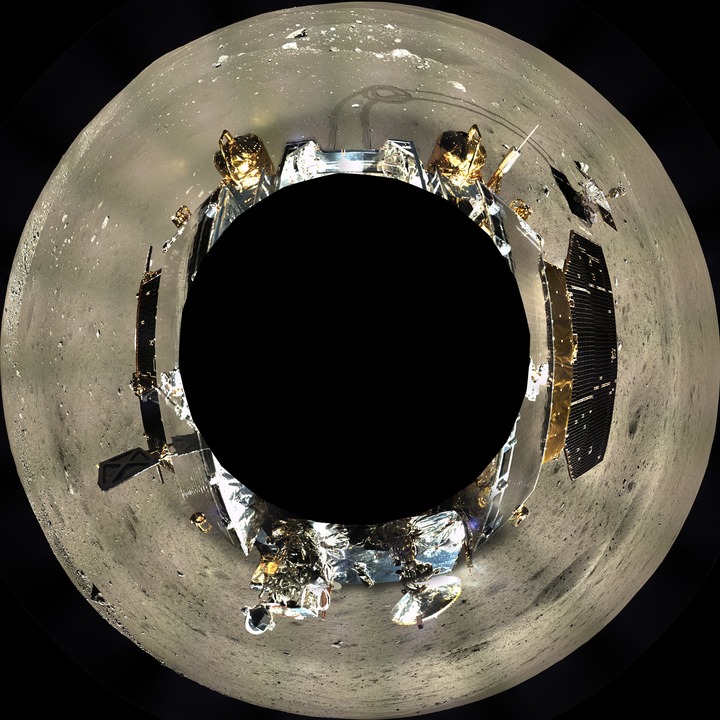 这是嫦娥三号地形地貌相机拍摄的着陆器周边360°范围的全景镶嵌影像图,采用方位投影方式表达(2013年12月17日至12月18日摄)。新华社发