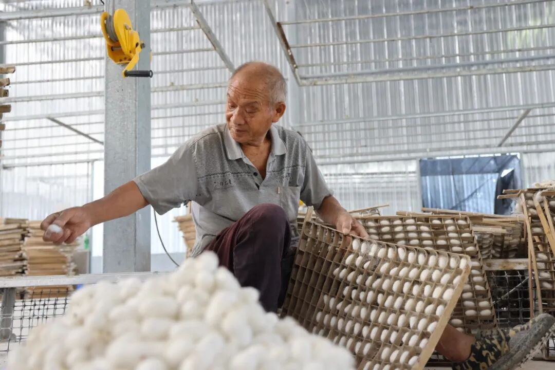 “早上七点开始,下午两点左右就能收工,劳动强度不大,室内干活也不怕晒。”万山村四组73岁的村民张颂容一边熟练摘茧一边说。他虽年逾古稀,但身体硬朗,利用农闲时间来基地摘茧,既活动了身体,又能增加收入。在万山村,像他这样在桑蚕基地灵活务工的老年人有近20位。