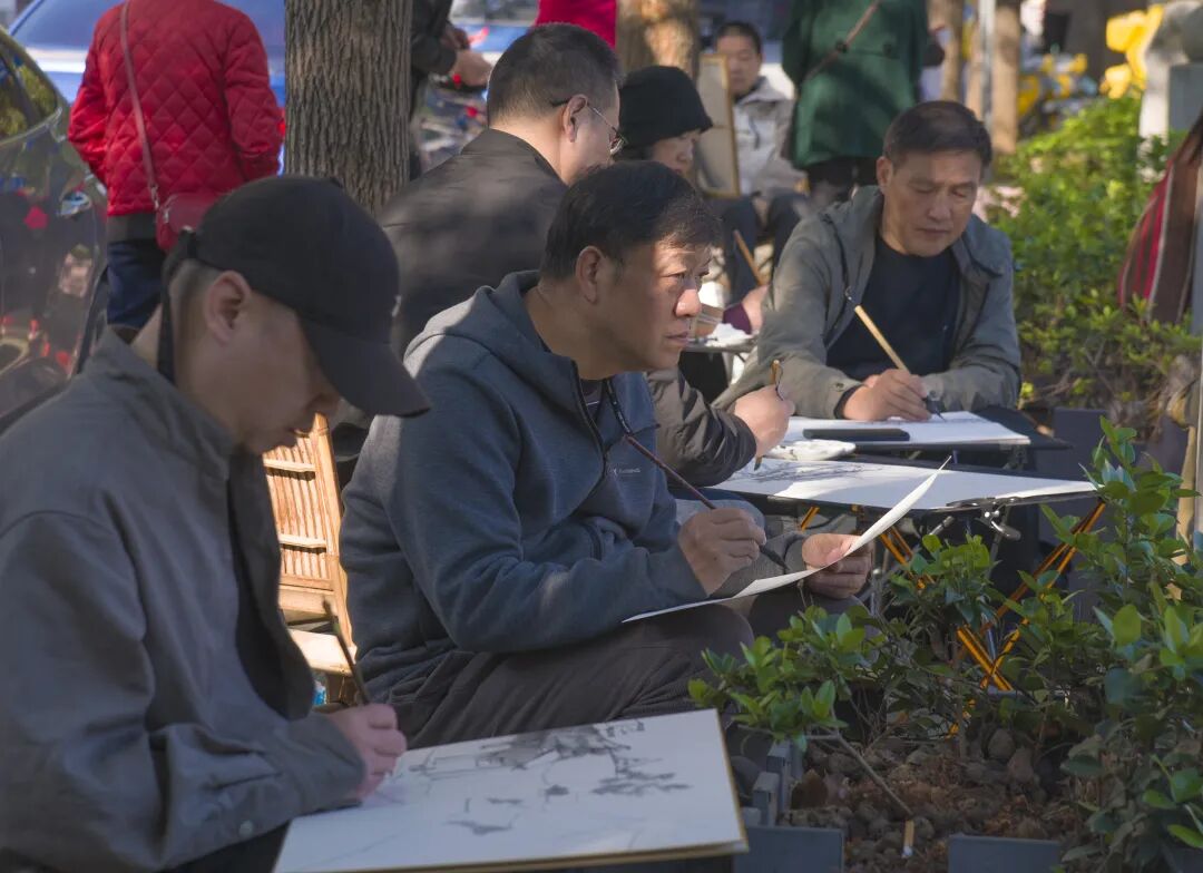 写生现场,艺术家们分散于宣风楼、穿城河、西直街等核心点位,创作身影遍布古城角落。他们或立于青石板路挥毫,精准勾勒明清院落的飞檐翘角与砖瓦肌理;或蹲坐巷陌调色,细腻捕捉市井摊贩的街巷闲趣,将古城的烟火气息与人文韵味尽数融入笔下。