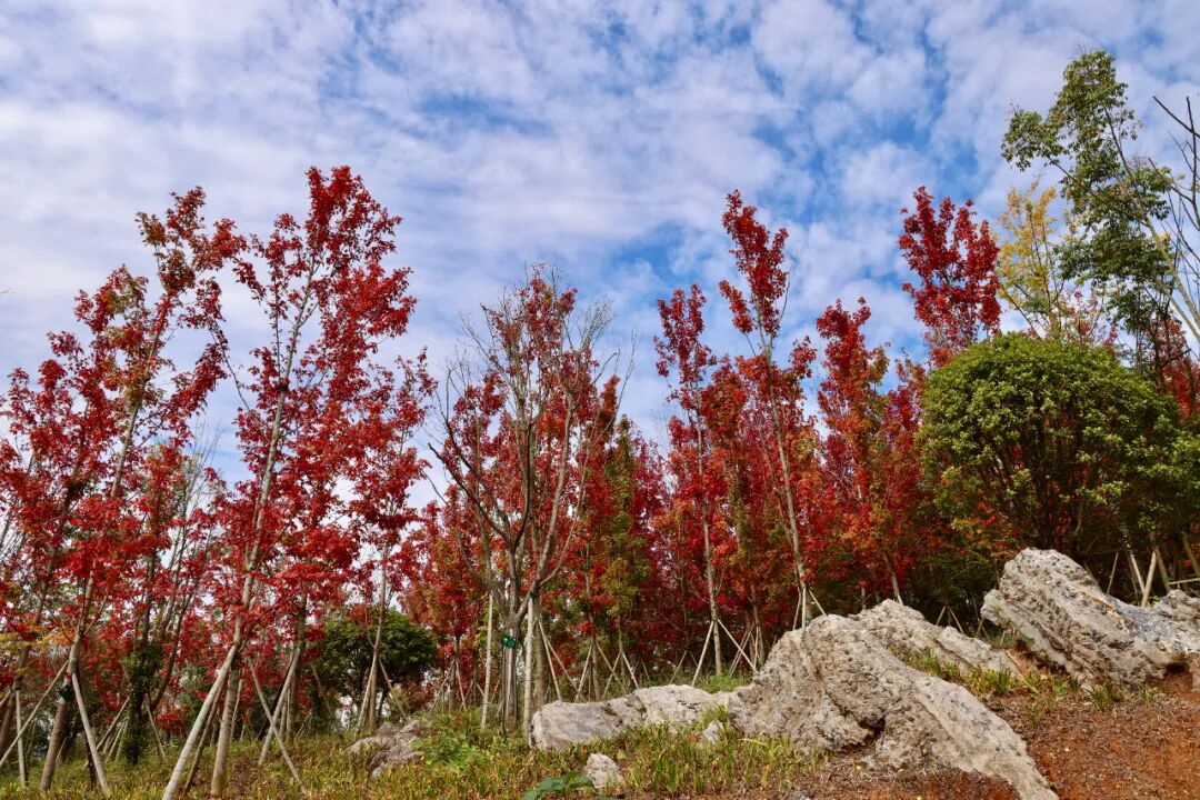 步入红枫林,“霜叶红于二月花”的诗意在此完美呈现。步道两侧,枫树挺拔整齐,在暖阳与秋风的沐浴下,叶片已大多转为深红。林间红、绿、黄三色交织,构成一幅温暖而生动的秋日画卷。