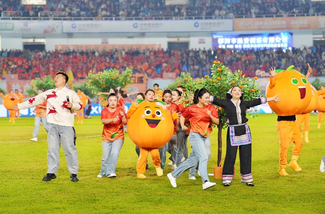 当中场表演《山水育橙·橙耀崀山》登场,新宁崀山脐橙的甜美与足球赛场的激情完成了诗意交融。这首作品不仅唱出了“中国脐橙第一县”的产业自信,更艺术化地呈现了一条完整的产业链故事:从1952年移栽首批8株母树,到如今年产量70万吨、品牌价值突破60.29亿元的“金色名片”,脐橙产业已成为邵阳农业经济的支柱产业。